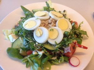 lunch op het werk: salade met ei en hamreepjes