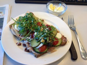 bruine boterhammen, eitje, tomaat, komkommer, augurk en rucola